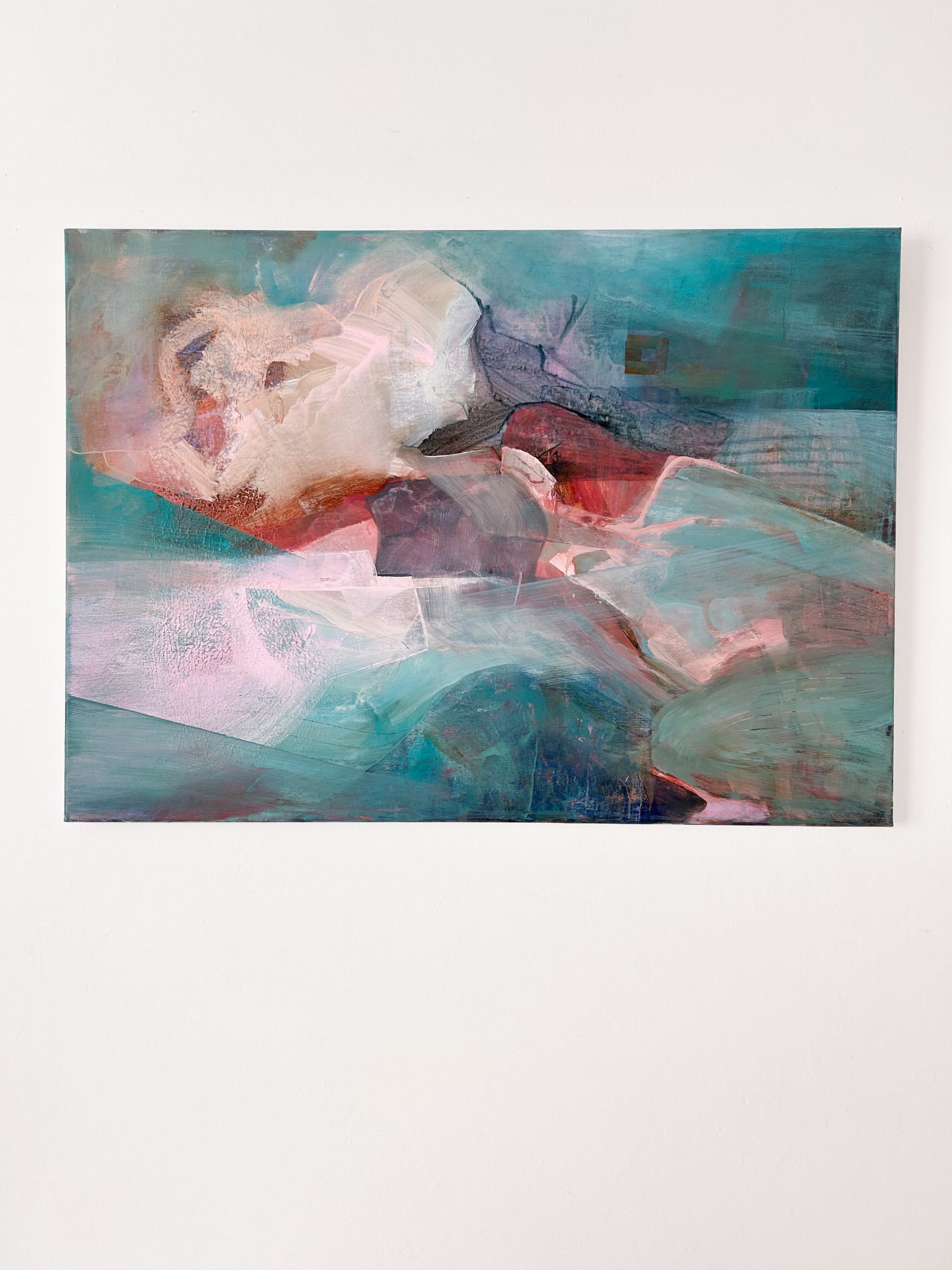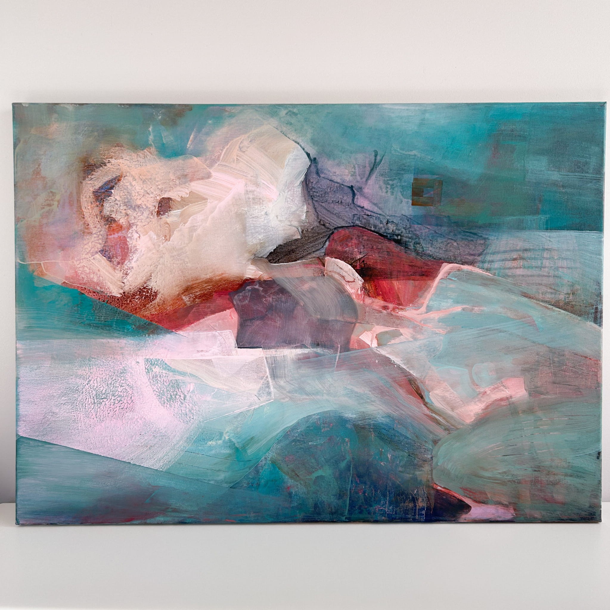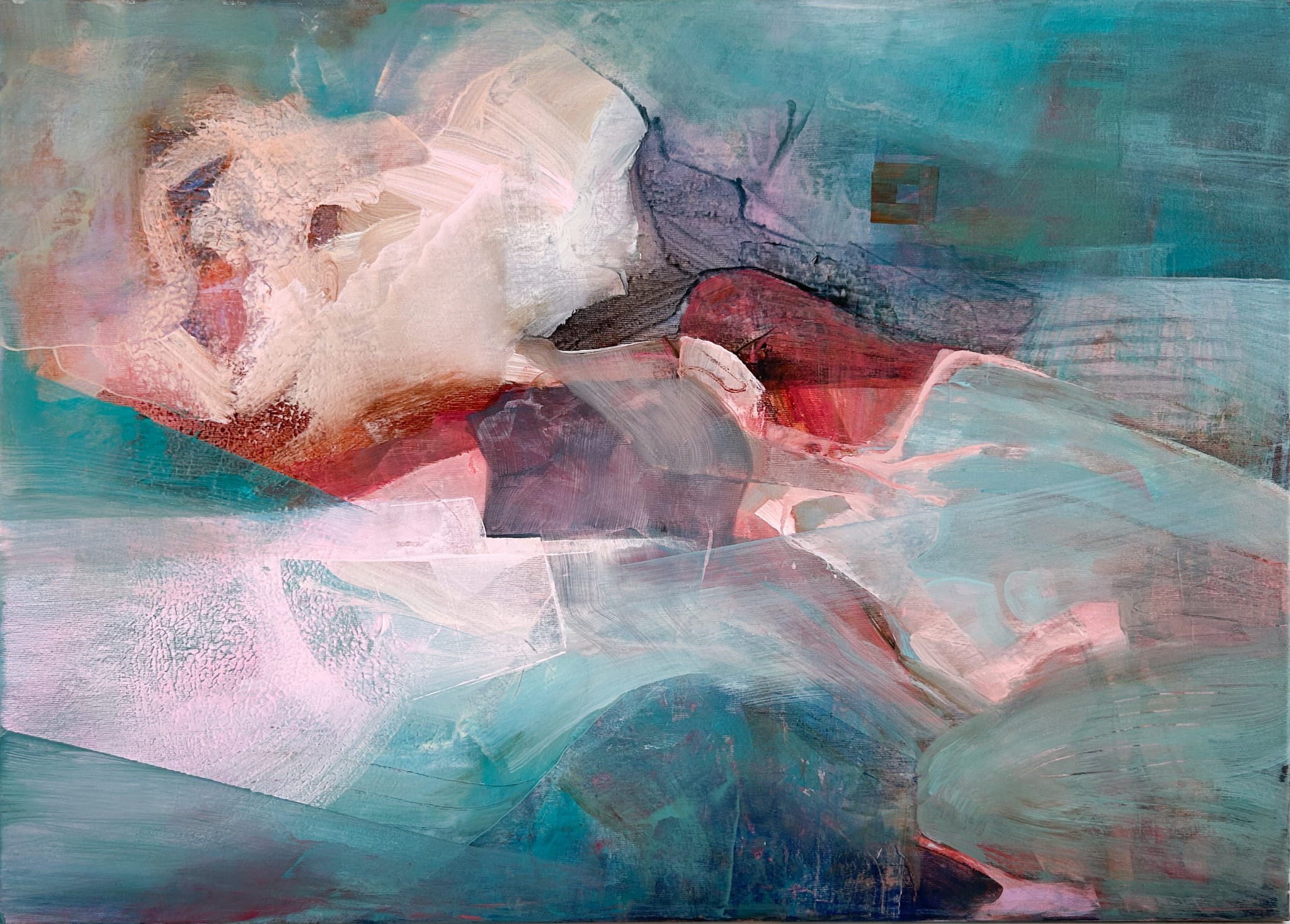 Obraz powstał w technice mieszanej na płótnie, w odcieniach turkusu, różu, lilii i ciepłych szarości. Delikatne przenikanie barw i warstw tworzy wrażenie przestrzeni i ruchu — jakby fragment wspomnienia lub sennej wizji.