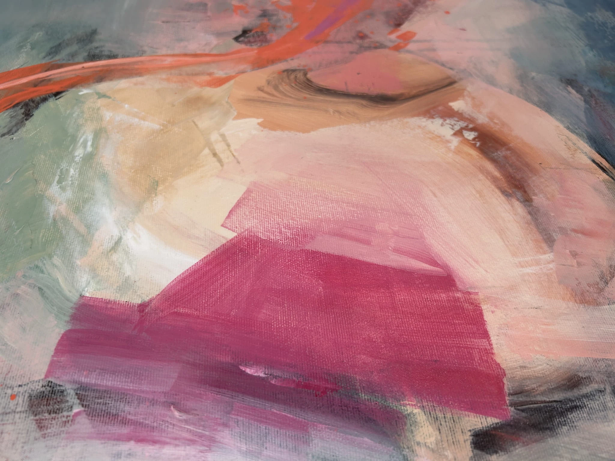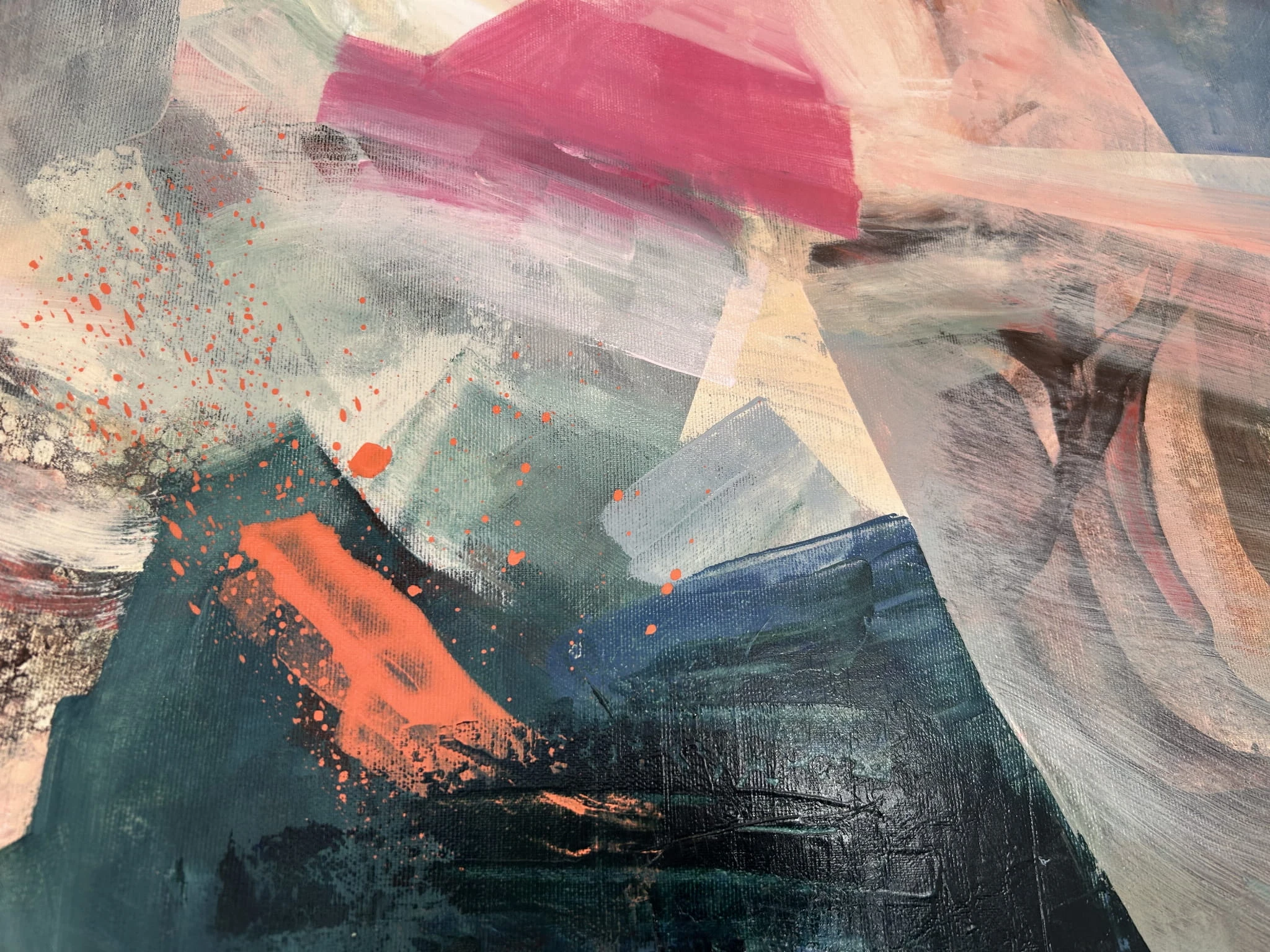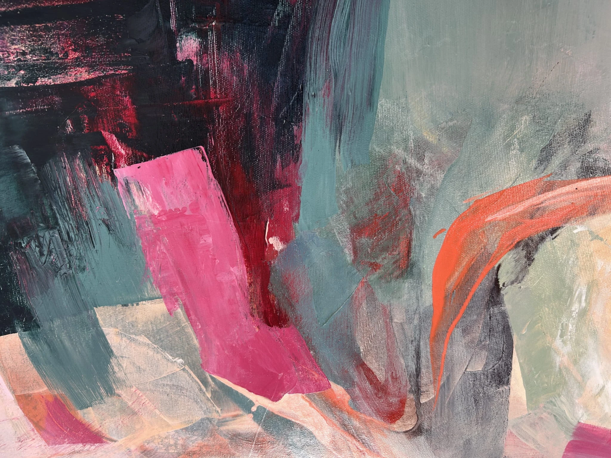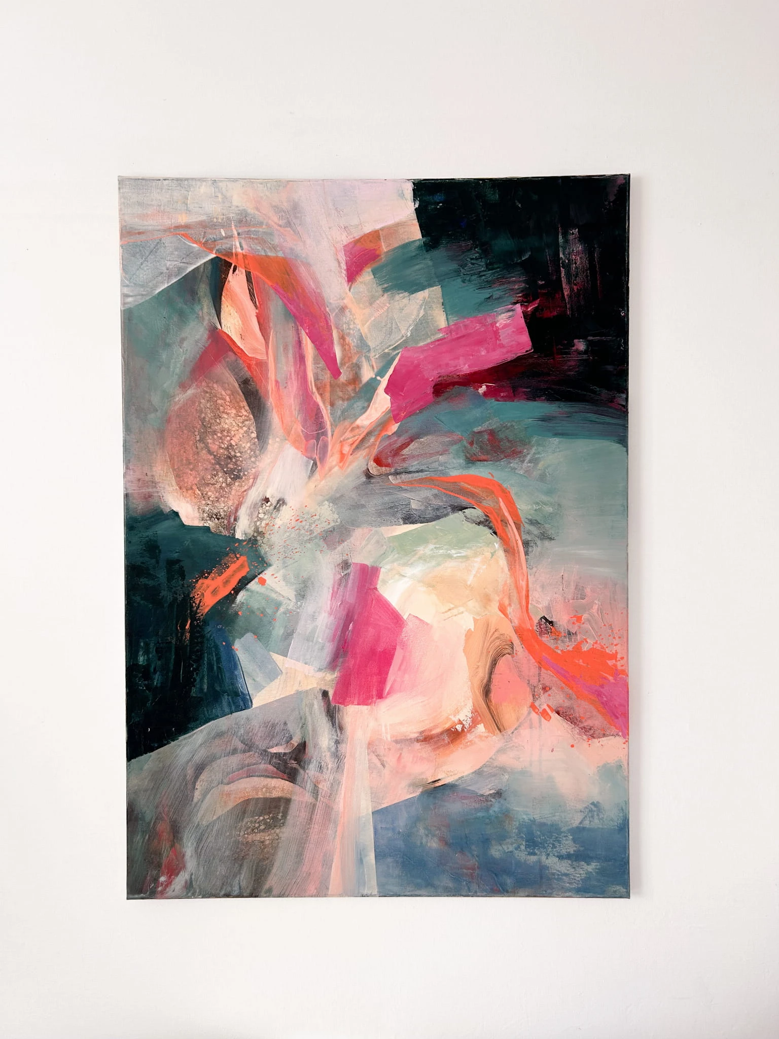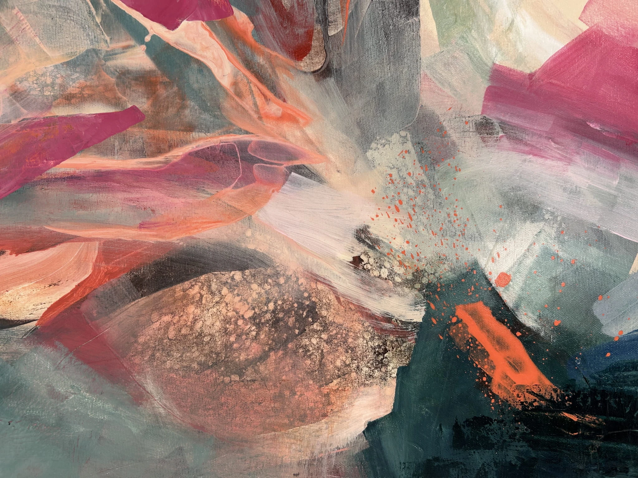 „Siły witalne” to energetyczna, pełna ekspresji abstrakcja, w której intensywne barwy splatają się ze sobą w dynamicznym, pulsującym rytmie. Kompozycja opiera się na odważnym połączeniu różów, oranży, turkusu i głębokich ciemnych tonów, tworząc wizualną opowieść o przepływie wewnętrznej energii, odrodzeniu i sile, która motywuje do działania.
